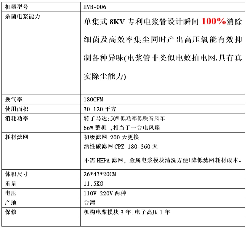 本净化器采用专利的电浆管杀菌除尘方式.可去除甲醛、香烟烟雾并免用高价需更换HEPA滤网为市上最强高效空气净化机机种.经台北科技大学研究所多次重复针对各类最顽强的细菌、病毒、霉菌进行实验,结果惊人发现,对于甚至微小到0.02微米的超小颗粒以及比细菌还要小的病毒颗粒,禾年电浆空气清净机的商用电浆清静系统都能快速且大量的完全清除,瞬间出风口达到0细菌.滤网上不再滋生任何细菌或微生物!